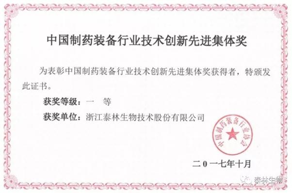 泰林生物榮獲“中國制藥裝備行業(yè)技術(shù)創(chuàng )新先進(jìn)集體一等獎”