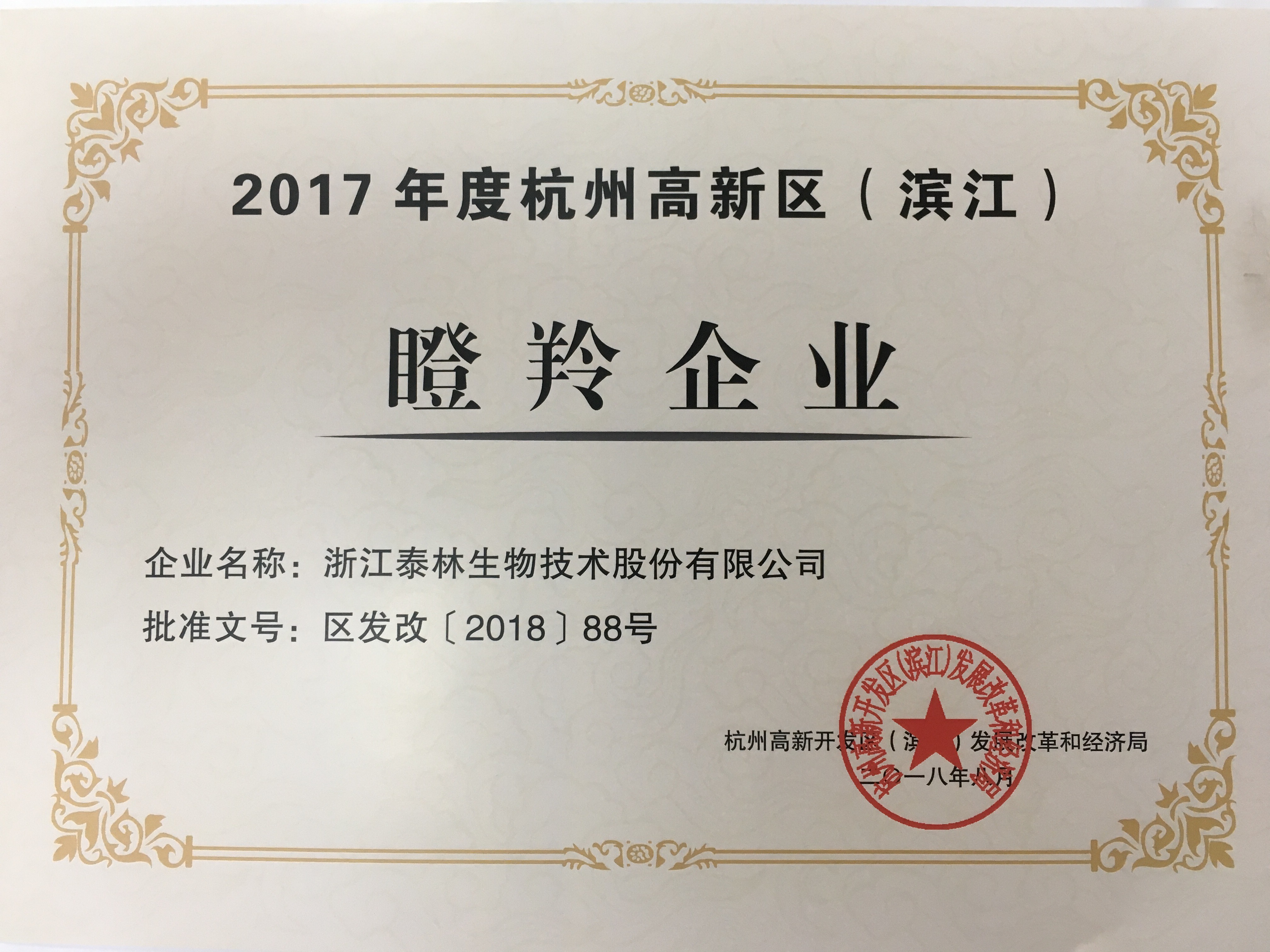 2018年8月下旬,2017年度高新區(濱江)瞪羚企業(yè)名單公布,浙江泰林生物技術(shù)股份有限公司榜上有名,標志著(zhù)泰林生物連續3年獲評高新區(濱江)瞪羚企業(yè)稱(chēng)號。